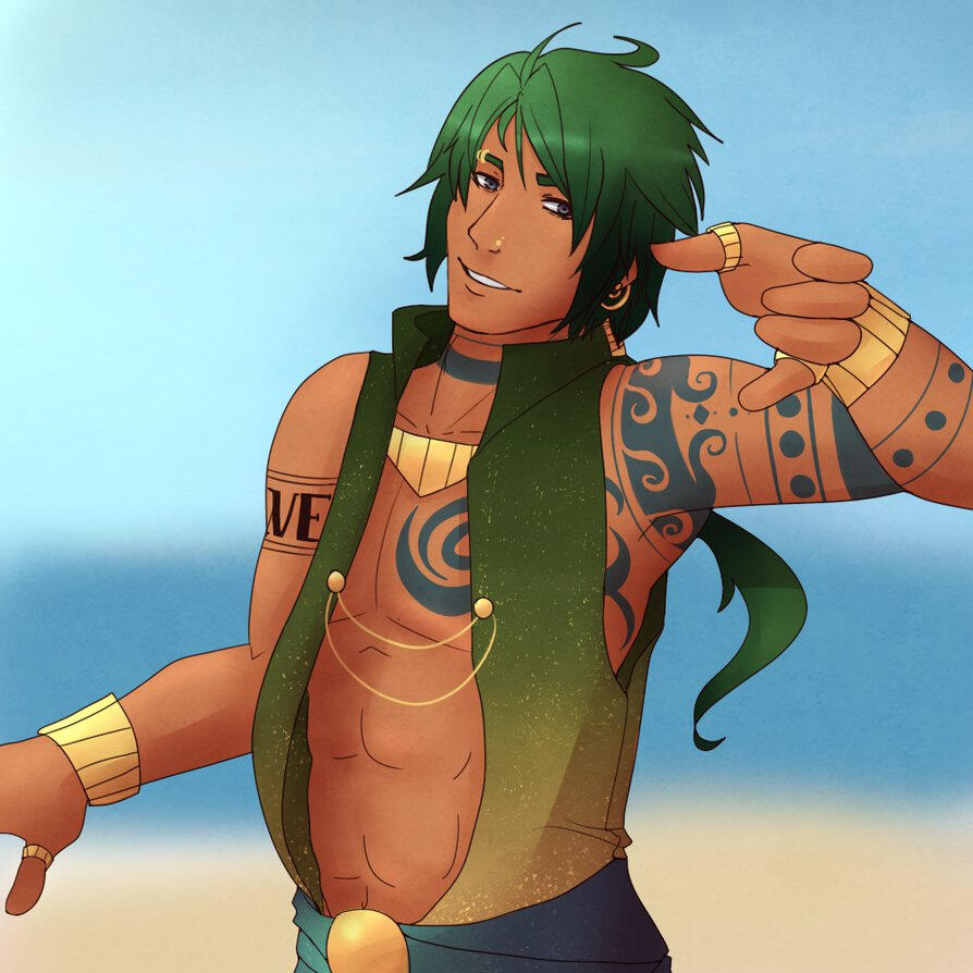 The life and bard of the party, River has a maxed out Cha score and a legendarily low Int.Bored of life on the idyllic and peaceful island that he comes from, River set out on a grand adventure to spread his passion for entertainment through the world! With a song held in his mind and his heart providing the beat to dance too, he seeks to inspire the world through his art.Don't let his perpetually cheery attitude fool you though, using a long list of magic spells and his twin blades Heart and Beat he can more than hold his own on the front lines of any party!