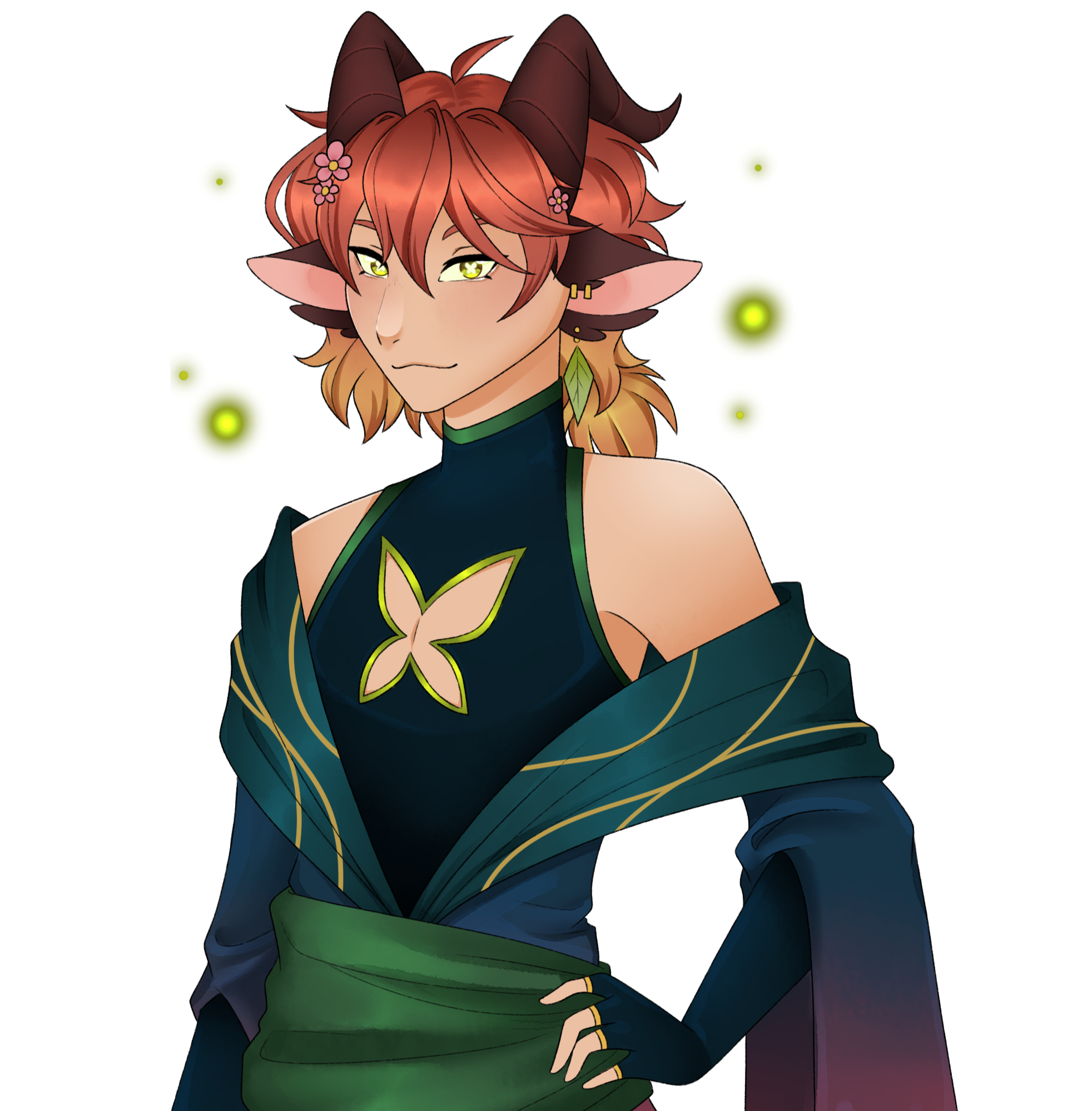 Solvae is a mischievous faerie dragon who always has something up their sleeves (it’s why they’re so big). They’ve been operating an Adventurer’s Guild in the fey lands after having already gone on their grand journey, and have recently decided to come out of retirement for another one.They’re a bit of a loudmouth, eccentric, and sarcastic. But surprisingly enough they’ve proven to be a reliable sort along with their hound shaped eidolon, Addie. Solvae is never seen without their trusted companion at their side.