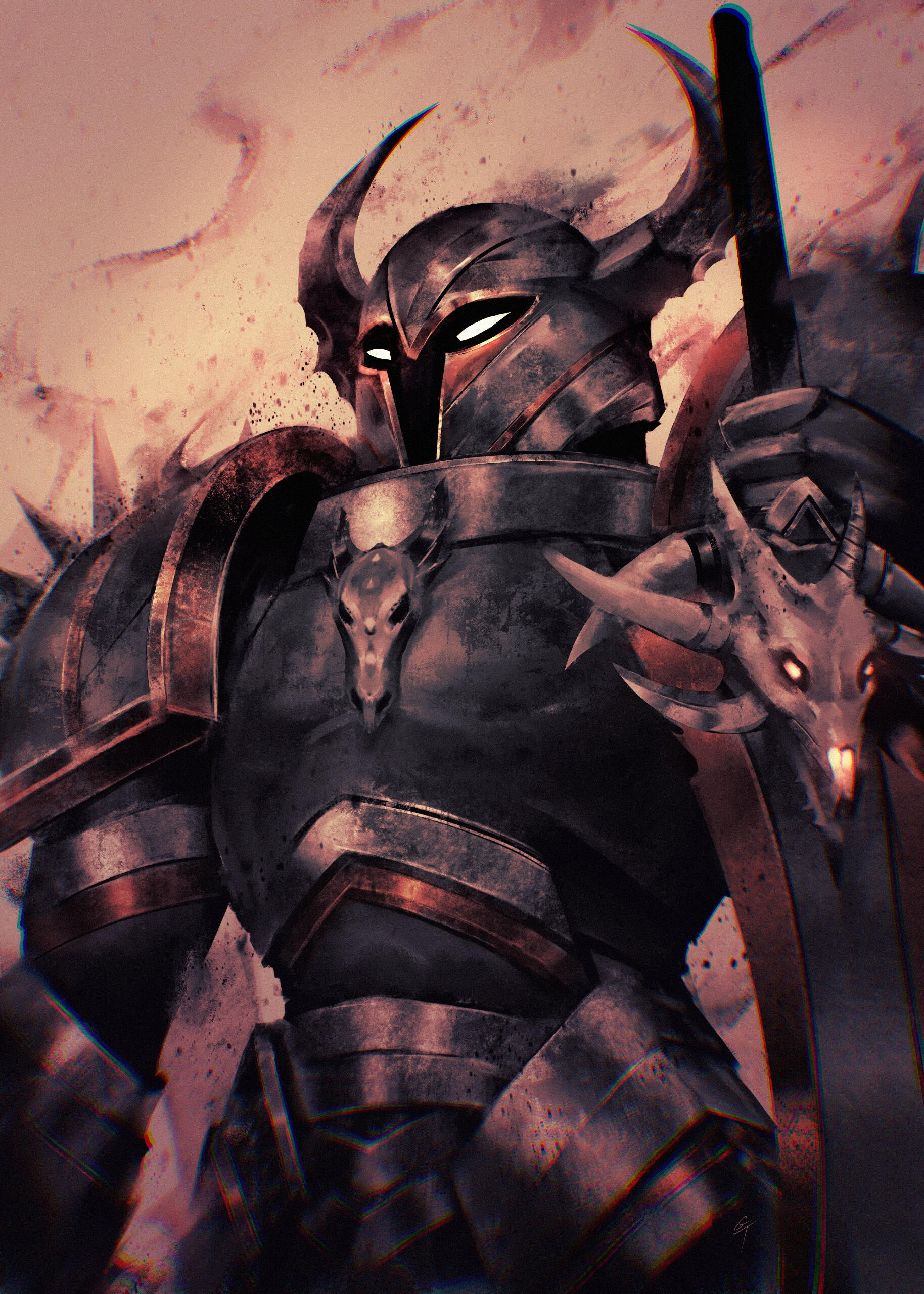 Recalling vague memories of his life as a mortal man, Geddon's sense of emotions and humanity are deadened by his affliction with the Graveknight curse. Soulbound to his armor, he cannot truly die and can possess the body of anyone who wears his armor in the event of his defeat. Having absorbed the soul of a Lich and an Arch-Devil, hes skills and powers are above the standard graveknight with an ambition to match. His one goal is to possess enough pact-bound souls in order to fuel his power further to means that no one but him can surmise.He is patient, slow to anger, and prefers negotiation over warfare as he values unslain mortal life to persuade their souls to his service. Geddon's machinations are capable of spanning years and generations. Heavily entwined with the crazy shenanigans of a certain goblin witch maid that he greatly "fancies", he is a mix of Darkseid and Castlevania's Dracula, but honor-bound by his word and edicts. Rarely lying and even more rarely betraying his previous intent and statements.